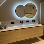 Vrijstaand bad in solid surface, dé blikvanger van deze ruimte.