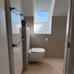 Leuk detail: de toiletborstel zit geïntegreerd in de tegelmuur. Subtiel en perfect voor deze ruimte.